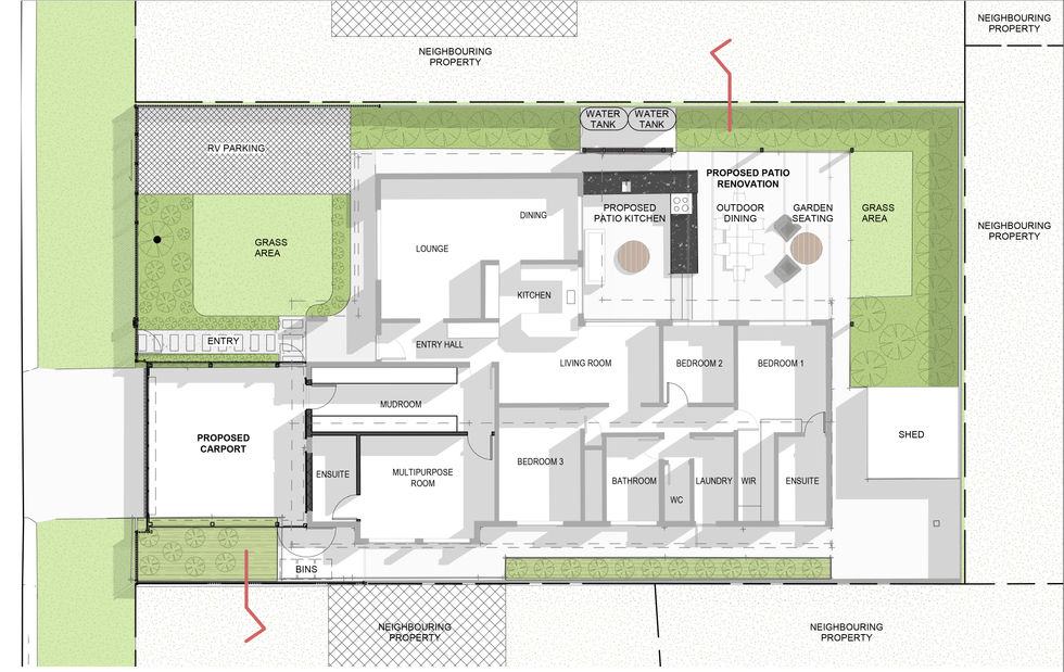 Alterations and additions to an existing 1 storey brick residence in Carindale, Brisbane. The brief encompasses a new secure carport, fence and pedestrian entrance to the front, conversion of the old garage into a multip-purpose master suite, and renovated rear patio complete with newenvironmentally responsive roof, outdoor kitchen, and gardening work space.